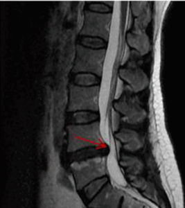 Figuur 1. Patiënt met hernia op niveau L4–L5, maar zonder lage rugpijn. Dit benadrukt dat structurele afwijkingen zichtbaar op MRI niet altijd samengaan met klachten of pijnervaring.